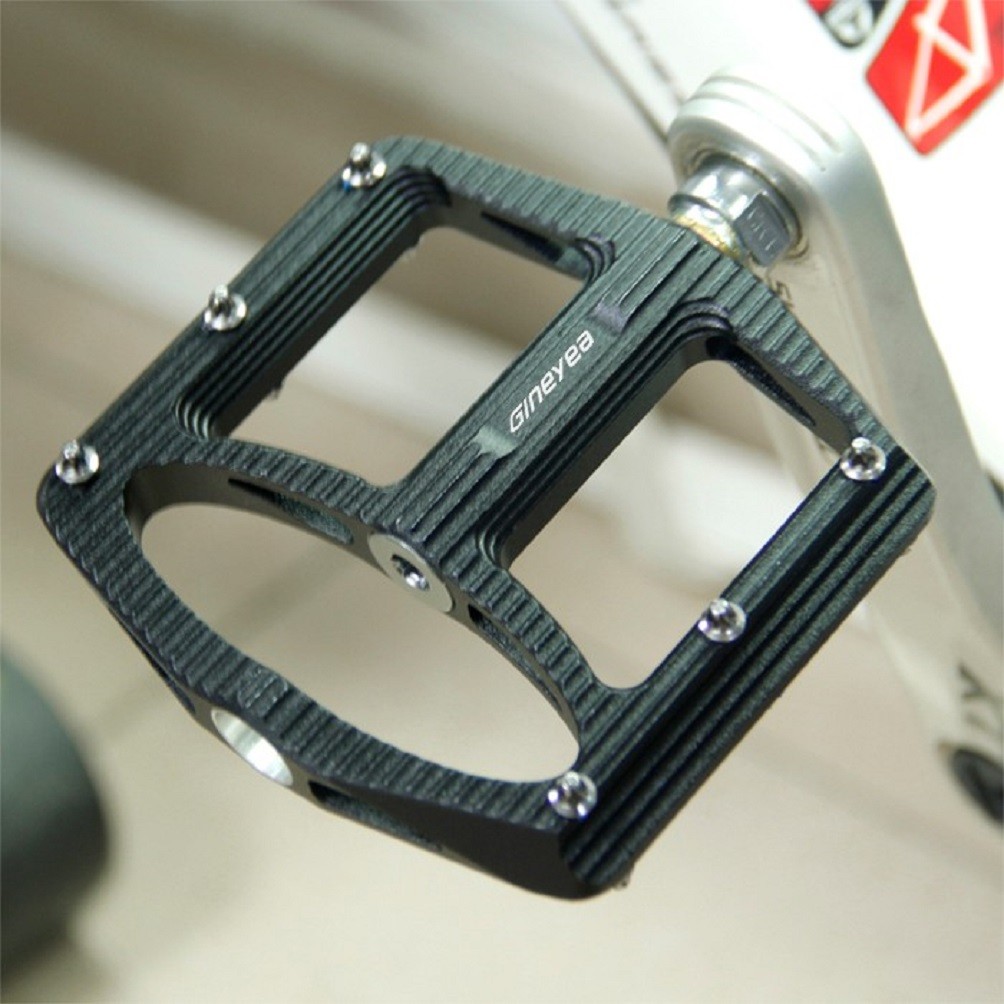 自行車踏板結構的改進,其包含二結合板以及軸桿,二結合板中心處具有一軸部,并相對蓋合預留設有軸桿槽,且軸桿槽周壁形成具厚度的貼合面,而二結合板兩側均由軸部向外延伸有踩踏板部,再由踩踏板部的外端緣相對延伸有組合肋部,且二結合板相對蓋合的組合肋部表面設有凸,凹結合部相互卡嵌固定,由此當二結合板組合時,其軸部與兩側組合肋部間形成簍空狀,大幅降低踏板容積,進而減少踏板整體重量,且該組合肋部間另以相對應的凸,凹結合部嵌合定位,再搭配螺合件的螺鎖固定,增添踏板組成的結構強度,提升整體的實用性及耐用度.