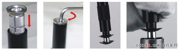 若是碳纖前叉一般選用膨脹花,把膨脹花螺絲松到可以放進前叉立管,如圖1;再用6mm扳手把螺絲鎖緊,如圖2。