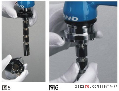 3.2 在穿入下碗時,請注意下碗碗口向下方,并把組裝工具下培林座也穿入工具主軸螺桿同時卡好檔片,如圖5、圖6。