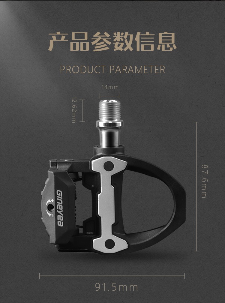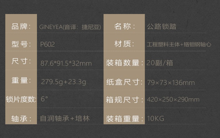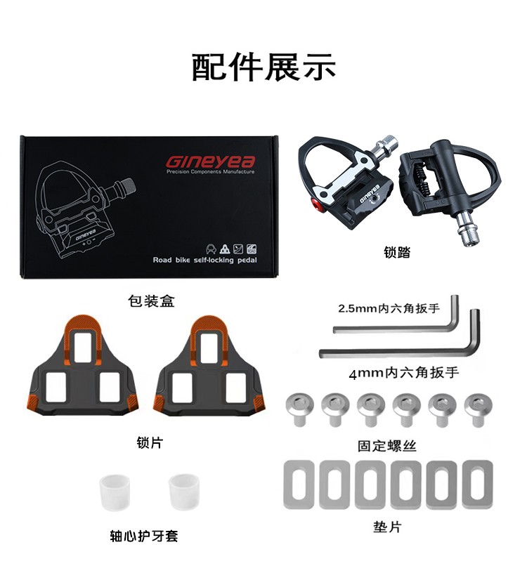 產品描述:品牌:GINEYEA(捷尼亞) 型號:P602 品號:13010426 品名:公路車鎖踏PRO(附鎖片6°)黑色執行標準:ISO4210 工藝:本體及扣片注塑成型材質:本體及扣片為工程塑料 軸心為鉻鉬鋼 顏色: 黑色/紅色/淺藍/橙色#公路車專業自鎖鎖踏,適用SPD-SL系統,自帶鎖片體驗不一樣的騎行速度、穩定、省力,踏板流線型一體化設計,高強度質量輕的尼龍材料加持,一對鎖踏僅重約278g,鎖片重量約88g,松緊度可調節的張力設置,靈...
